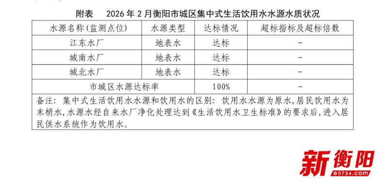 衡陽(yáng)新聞網(wǎng)訊 記者邵俊杰報(bào)道 日前,衡陽(yáng)市生態(tài)環(huán)境局發(fā)布2026年2月城區(qū)集中式生活飲用水水源水質(zhì)狀況報(bào)告,監(jiān)測(cè)數(shù)據(jù)顯示,2026年2月,衡