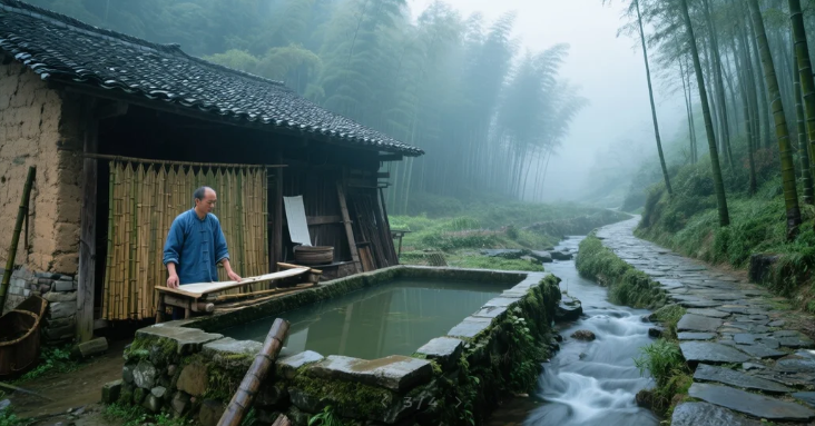 那是2024年國(guó)慶后的采風(fēng),我循著“一紙千年”的傳說(shuō),走進(jìn)黃市鎮(zhèn)的蔡倫竹海。晨霧還未散盡,青石板路沿著溪流蜿蜒,遠(yuǎn)遠(yuǎn)就聽見“嘩啦——唰”的聲響,混著竹濤聲格外清亮。拐過(guò)一道竹林掩映的山坳,幾間黛瓦土墻的作坊映入眼簾,溪流在門前圍成方塘,一位穿藍(lán)布衫的匠人正站在塘邊的紙槽前,手中竹簾一沉一蕩。