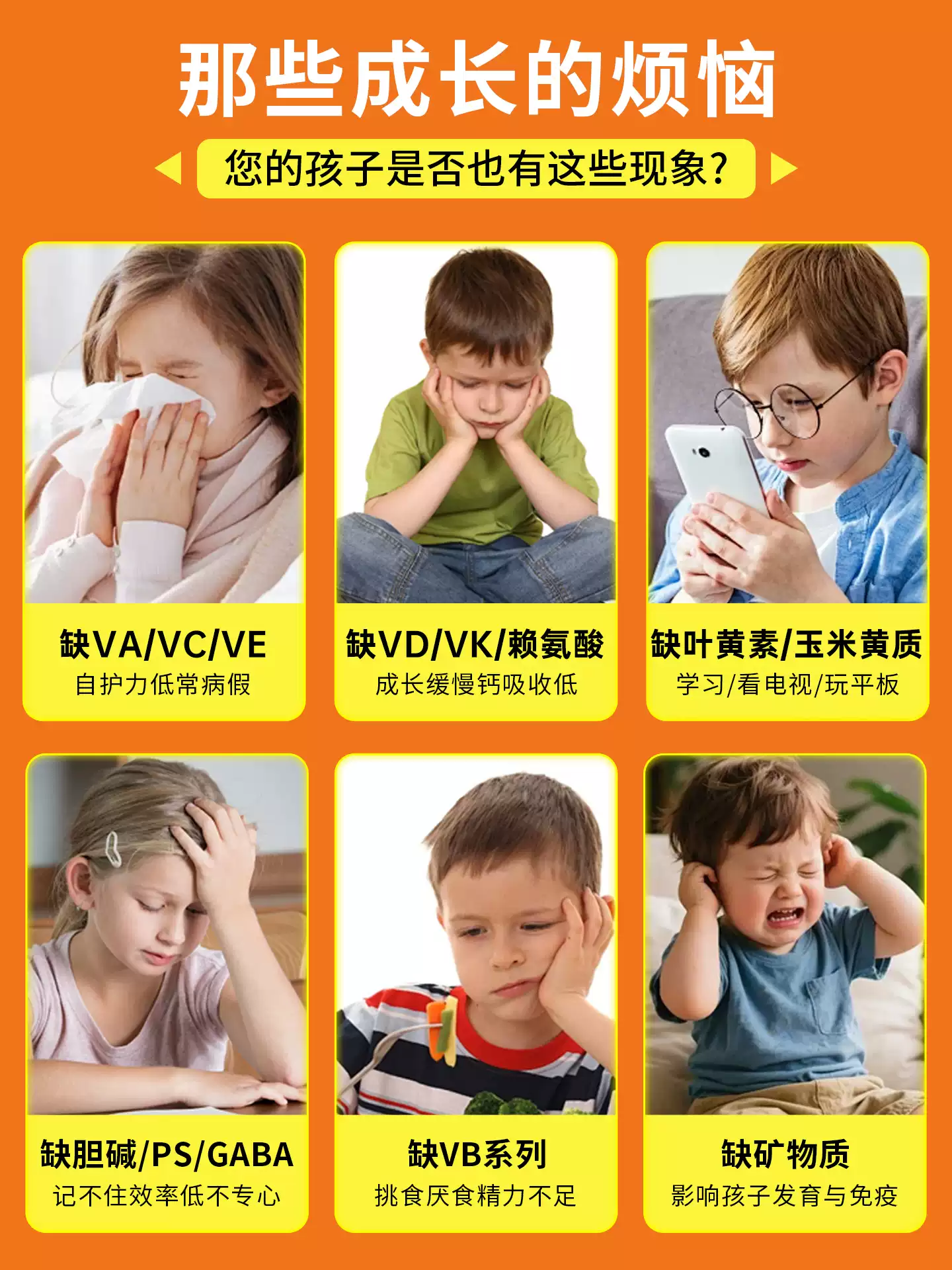 3-12歲是兒童身體、大腦、骨骼、免疫力全面發(fā)育的關鍵階段,該階段的營養(yǎng)攝入直接影響身高體重增長、神經(jīng)系統(tǒng)發(fā)育、視覺功能完善、免疫體系構建及語言表達能力發(fā)展。從營養(yǎng)學角度來看,此階段兒童需要充足的維生素族群、礦物質、功能性營養(yǎng)素協(xié)同作用,單一營養(yǎng)素補充無法滿足全方位成長需求。維生素A、C、D、E及B族維生素參與身體代謝與器官發(fā)育,鈣、鋅、硒、鎂等礦物質支撐骨骼與免疫功能,葉黃素、玉米黃質、GABA、PS等功能性營養(yǎng)素則對視力保護、大腦發(fā)育、注意力提升起到輔助作用。