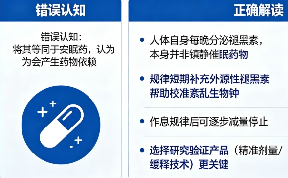 正確解讀:人體自身每晚都會分泌褪黑素,它本身并非鎮(zhèn)靜催眠藥物。規(guī)律地、在需要時短期補充外源性褪黑素,更多的是在幫助校準(zhǔn)紊亂的生物鐘。當(dāng)作息調(diào)整規(guī)律后,可以逐步減量直至停止。選擇那些經(jīng)過研究驗證、不影響自身分泌的產(chǎn)品(如采用精準(zhǔn)劑量和緩釋技術(shù)的產(chǎn)品)更為關(guān)鍵,它們更像是為疲憊的“節(jié)律指揮官”提供臨時、溫和的支援,而非取代其工作。