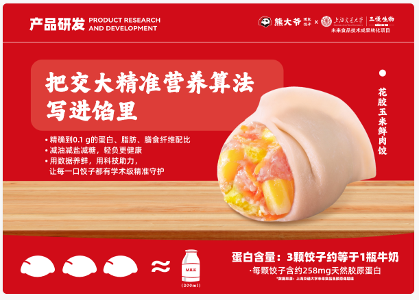 持續(xù)的產(chǎn)品創(chuàng)新是門店維持核心競爭力、提升客單價(jià)的關(guān)鍵,也是保障長期盈利的重要支撐。熊大爺積極響應(yīng)“健康中國2030”號召,在產(chǎn)品研發(fā)上持續(xù)發(fā)力,與上海交通大學(xué)食品科學(xué)與工程系科學(xué)家聯(lián)合成立“減糖專項(xiàng)課題”,通過藥食同源天然食品源技術(shù),開發(fā)低GI系列健康產(chǎn)品,精準(zhǔn)貼合當(dāng)下消費(fèi)者的健康飲食需求。雙方聯(lián)合研發(fā)出“花膠蝦肉玉米餃”。